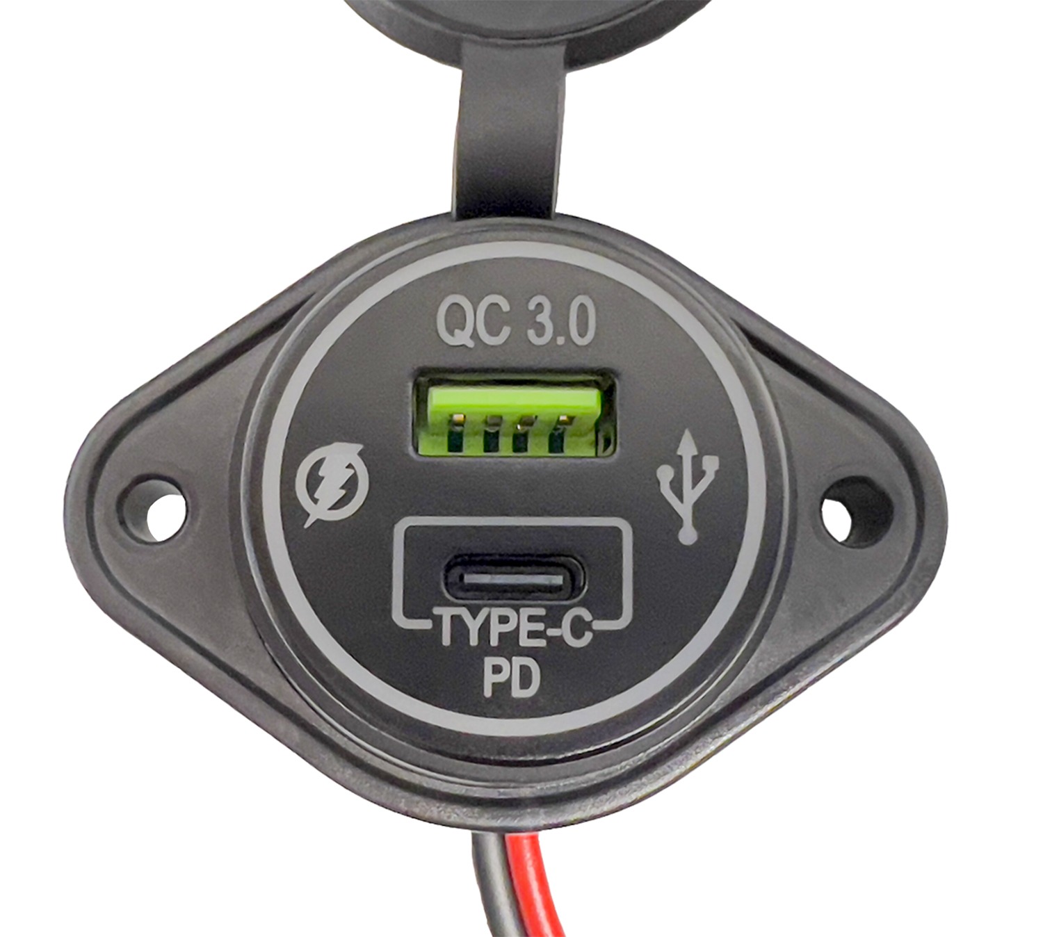Vedenpitävä 12/24V USB-C/A virta-adapteri pikalatausmahdollisuudella.